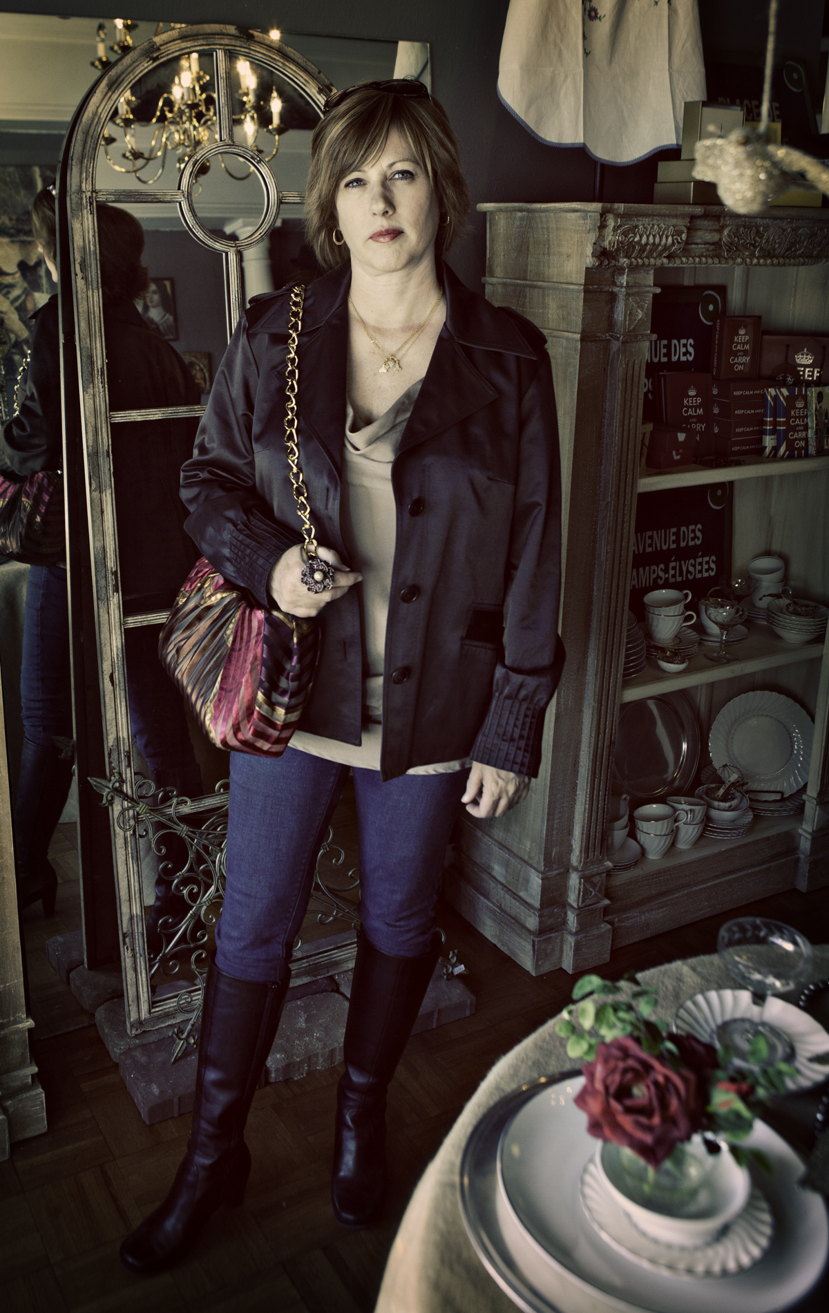 Coat: ISDA & Co., Shirt: Ya, Boots: Courtesy of ECCO, Jeans: LOFT, Handbag: Courtesy of Via Chic®, Scarf: Vintage, Ring: Courtesy of Emma Stine Jewelry, Necklaces: Courtesy of Emily Elizabeth Jewelry, Sunglasses: Juicy Couture.